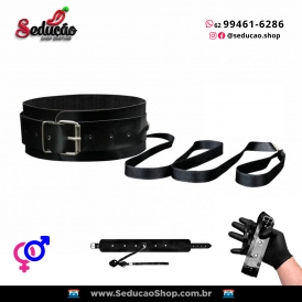 Coloque a coleira ao redor do pescoço e ajuste para um encaixe confortável. Prenda a guia como ferramenta de controle, mantendo a postura submissa e ampliando a intensidade do momento. Ideal para cenas de dominação com segurança, respeito e muito erotismo.