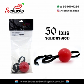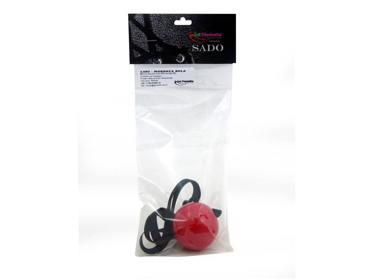 Mordaça tipo bola, possui tira em couro sintético com ajuste.
